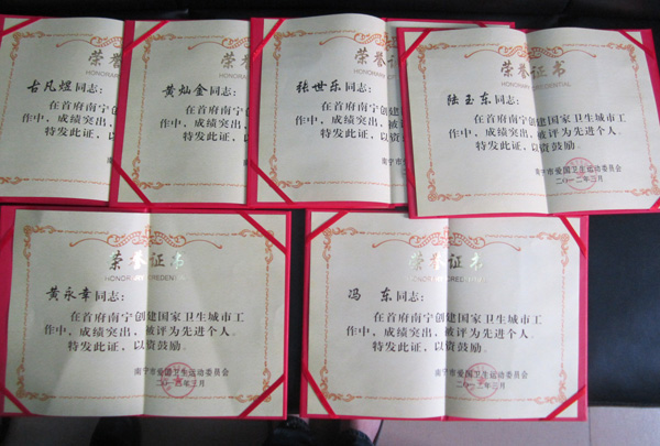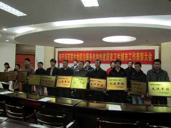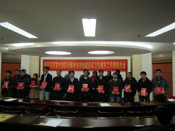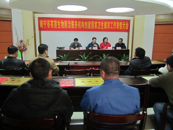 2012年3月8日,由南寧市愛衛(wèi)辦組織在市衛(wèi)生局隆重舉行了“南寧市有害生物防治服務(wù)機構(gòu)創(chuàng)建國家衛(wèi)生城市工作表彰大會”,南寧市康凈衛(wèi)生消毒殺蟲有限責任公司在首府南寧市創(chuàng)建國家衛(wèi)生城市工作中,成績突出,被評為先進單位以及本公司馮東等6名員工被評為先進個人,圖為李作慶副主任主持會議及頒發(fā)證書現(xiàn)場。