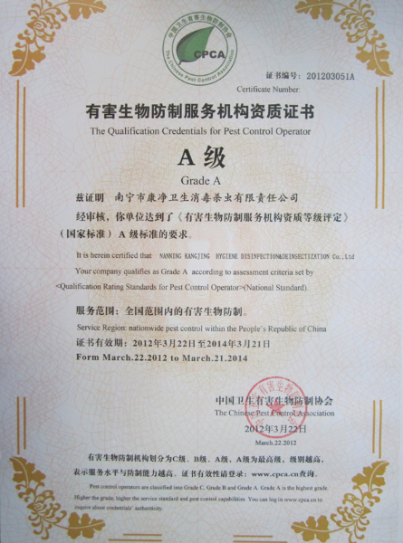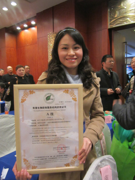 2012年3月21日-24日,中國衛(wèi)生有害生物防制協(xié)會2012年年會暨第四屆三次理事會在六朝古都南京市隆重召開,康凈公司被授予“中國有害生物防制服務機構(gòu)資質(zhì)A級證書”。年會是我國有害生物防制行業(yè)界最具規(guī)模與影響力的年度盛會,屆時,全國協(xié)會及會員單位、外國協(xié)會、省市地方協(xié)會(港臺協(xié)會)、愛衛(wèi)系統(tǒng)、疾控系統(tǒng)、科研院校、藥械生產(chǎn)與經(jīng)營企業(yè)、PCO企業(yè)等有關人士齊聚一堂,本次會議以“除四害與愛國衛(wèi)生運動——紀念愛國衛(wèi)生運動開展60周年”為主題,并對2011年通過A級資質(zhì)考評的全國10家PCO公司正式頒發(fā)資質(zhì)證書。圖為(中國衛(wèi)生有害生物防制協(xié)會)秘書長楊華林先生、(歐洲有害生物管理業(yè)協(xié)會)總干事Rob Fryatt 先生作報告,及頒發(fā)證書現(xiàn)場。